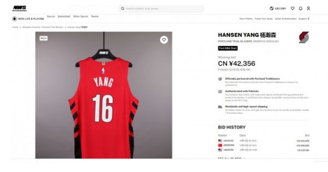 在12月8日开拓者客场96-119输给灰熊的比赛,杨瀚森迎来NBA生涯首次首发比赛,该场比赛他贡献4分5篮板2助攻。如今杨瀚森该场比赛首发穿的球衣,已经被拍卖最终成交价是42356元,展现出不俗的商业价值。