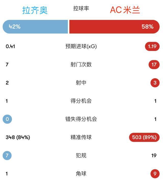 拉齐奥全场7次射门,预期进球数为0.41,只有2次射正,而米兰17次射门,预期进球数为1.19。